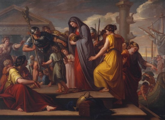 Subjects from ancient history provided a precedent, represented here by tableaus of the King of Sparta sparing the life of a rebellious son-in-law and Agrippina bringing the ashes of her husband Germanicus, son of the Emperor Tiberius, back to Rome.