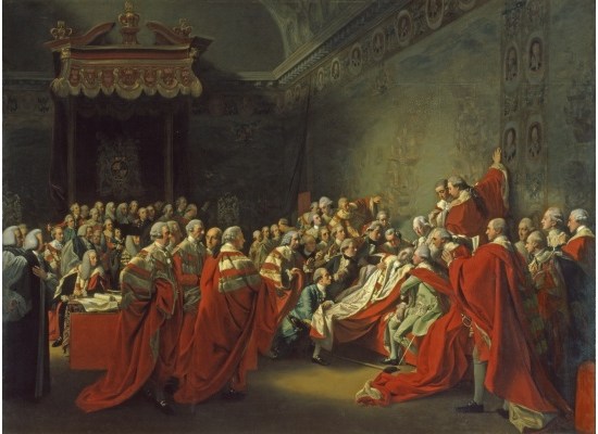 This was an ideal subject for a classic history painting, a significant point in the life of a great statesman and a great cause. The painter who took it up a year later was John Singleton Copley, American-born himself but recently arrived in England and an admirer of Chatham. He depicted the event on a grand scale, 10ft by 7ft 6in. There are 55 people in it, all individual portraits.