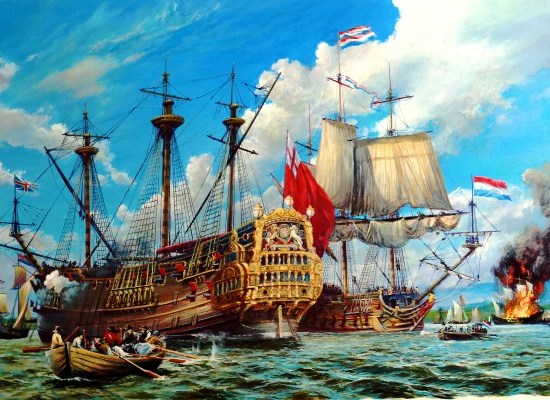 The Second Anglo-Dutch War was mostly aimed at keeping open English trade routes – for slaves, among other things. England had its moments, including the capture of New Amsterdam, later to become New York. But its navy was in a mess because of underfunding (King Charles II was widely suspected of giving the money to his mistresses). The sailors were often press-ganged, and unpaid – some of them even joined the Dutch navy, which treated its men better.