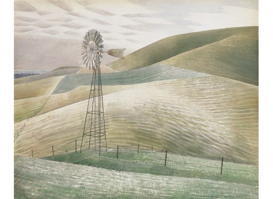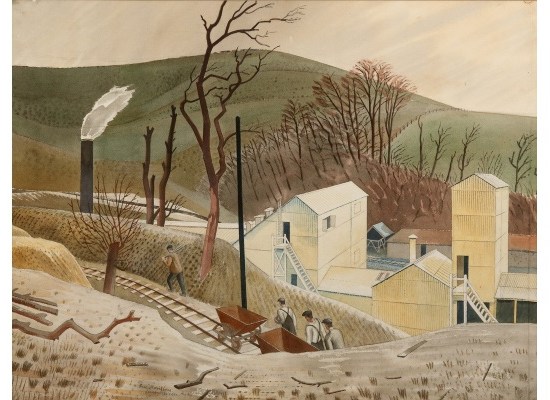 Ravilious was working at woodcuts but both artists wanted to paint watercolours which in fact were very fashionable at the time. Ravilious did produce a number of rural landscapes in this medium but they were quite close to being tinted drawings. Some however did include tractors and farm implements, a foreshadowing of the addition of odd objects such as the waterwheel and the abandoned farm implement which sometimes almost take the place of characters in his Downland paintings.