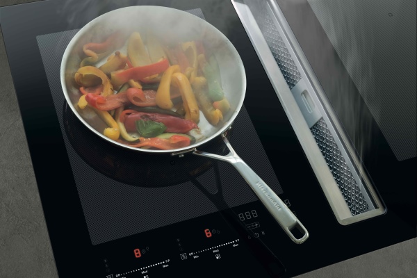 The downdraft extraction system, located in the middle of the hob, benefits from perimetral extraction and a 600 m3/h maximum air flow, which ensures grease, steam and odours are all effectively cleared, protecting furniture and improving the air quality of the home. Perimetral extraction technology extracts vapours from around the edges of the extractor, rather than the centre, creating a faster airflow and increasing grease extraction by 10 per cent.